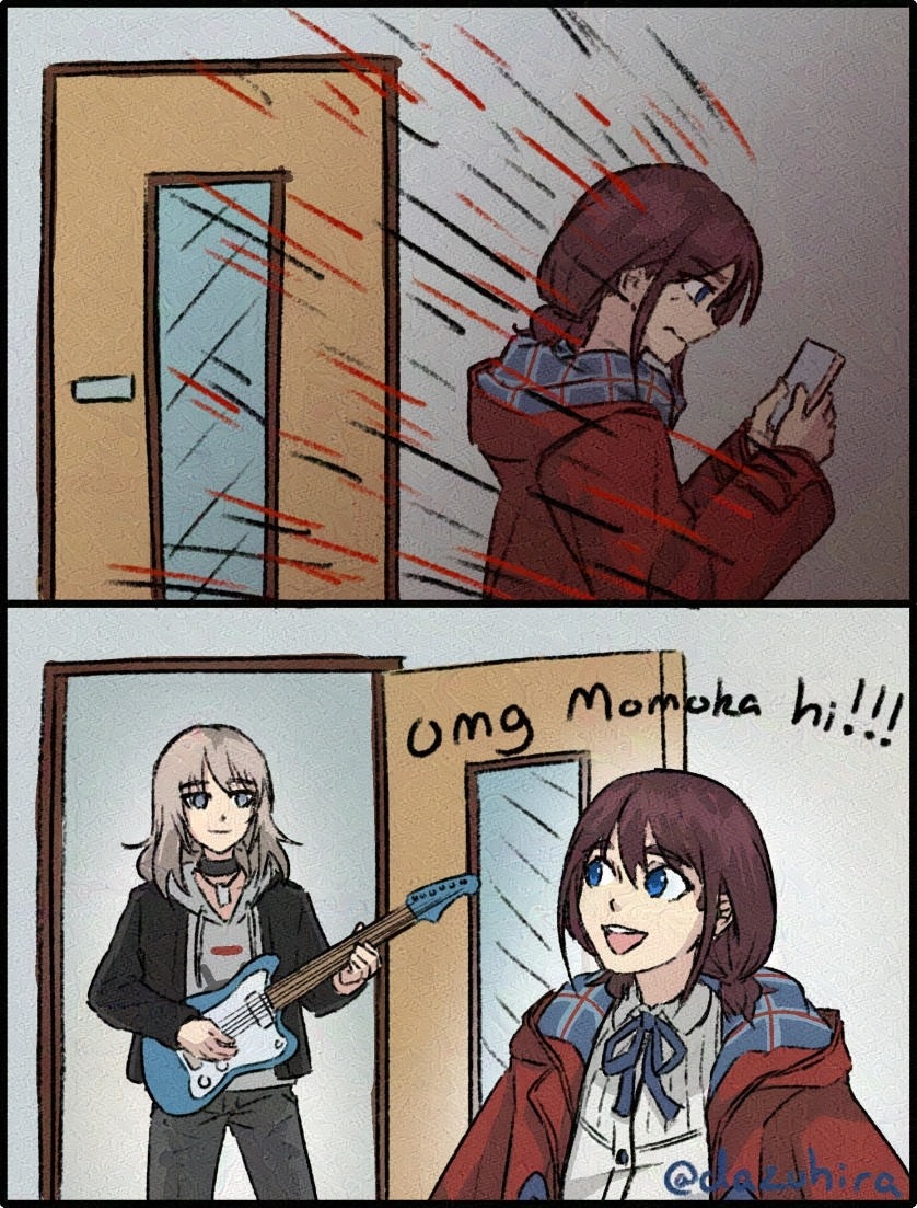 >>4472316I love the aesthetic, I love the slightest hints we got at what their relationship to each other could've been and considering post band breakup MomoNana, the overall theme of former friends turned lovers after they found each other again just tugs at my goddamn heart way too muchWhat hurts the most is that we've had like 5 artists drawing MomoNana back when the show was airingNowadays, 2 stopped drawing completely, 2 barely draw anything GBC related these days and the 5th switched to MomoNina, and the one you posted is the only one that still sometimes draws it, though their ship list is quite literally everyone with everyone, considering I've seen Hina with Tomo or Nina's sister drawn by themI genuinely started drawing just so I could be a MomoNana artist but these days I just do MyGO/Mujica related doodles to practice instead