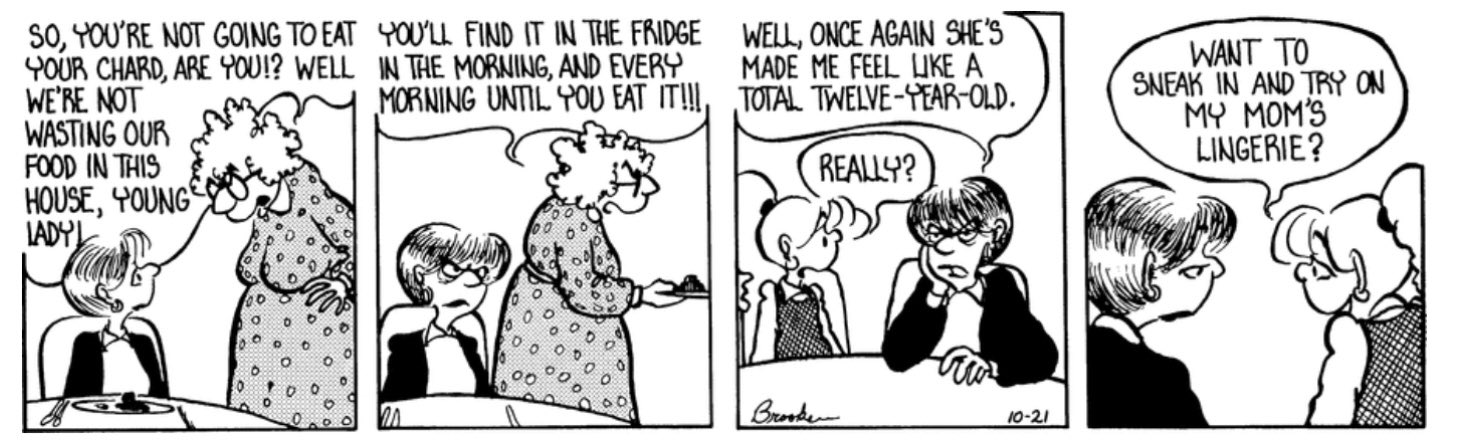>>4500875>>4500883>>4500893Not m/d specifically but there is one strip where the daughter is at her therapist's office. The therapist asks her if she feels like she has to be the mom some times; the panel pans out and the daughter was brushing the therapist's hair the whole time.
