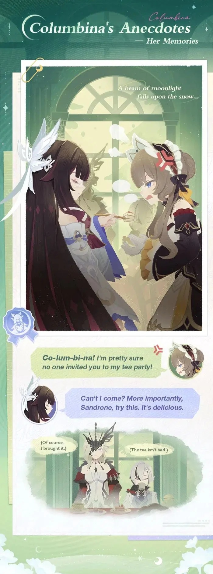 >>4542230Actually I feel like expanding more on that: Cissia feels very Belle-centric. The first time she stays over she sleeps in Belle's bed, and when she breaks in again during 2.7 she heads straight to Belle's room because it's her favorite. The "date" that you have with her on the rooftop of Bardic Needle is also really cute. She's dumb as fuck and lies as easily as she breathes and is a coward, but she's extremely endearing through it all and personally one of my new favorite characters in the entire game. Looking forward to her banner in 3 weeks and what ranking up a relationship with her will reveal.