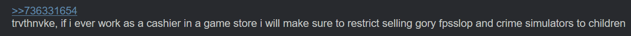 I played stuff like GTA and Manhunt as a kid but I would never allow other kids to play it lol. Like I know it didn't affect me at all while growing up but I fundamentally think it should be restricted to adults.