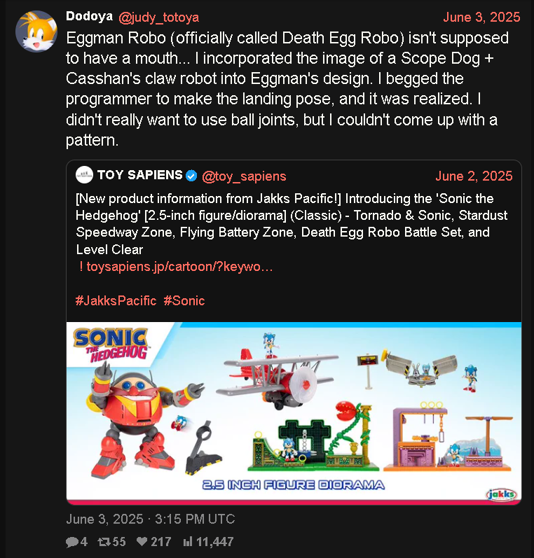 >>736312368>This is a retarded comparisonTails' creator Yasushi Yamaguchi said the Scopedog was one of the inspirations and a "Tsume Robot" from Casshernhttps://xcancel.com/judy_totoya/status/1929919920143511578>meme game seriesDon't call it that, despite some Sonic fans being super fucking reddit, its still a really sincere series