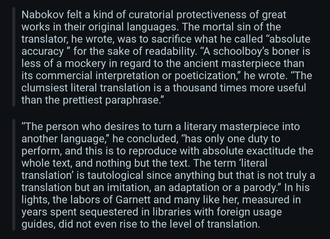 >>736157583>the clumsiest literal translation is a thousand times more useful than the prettiest paraphrase/thread
