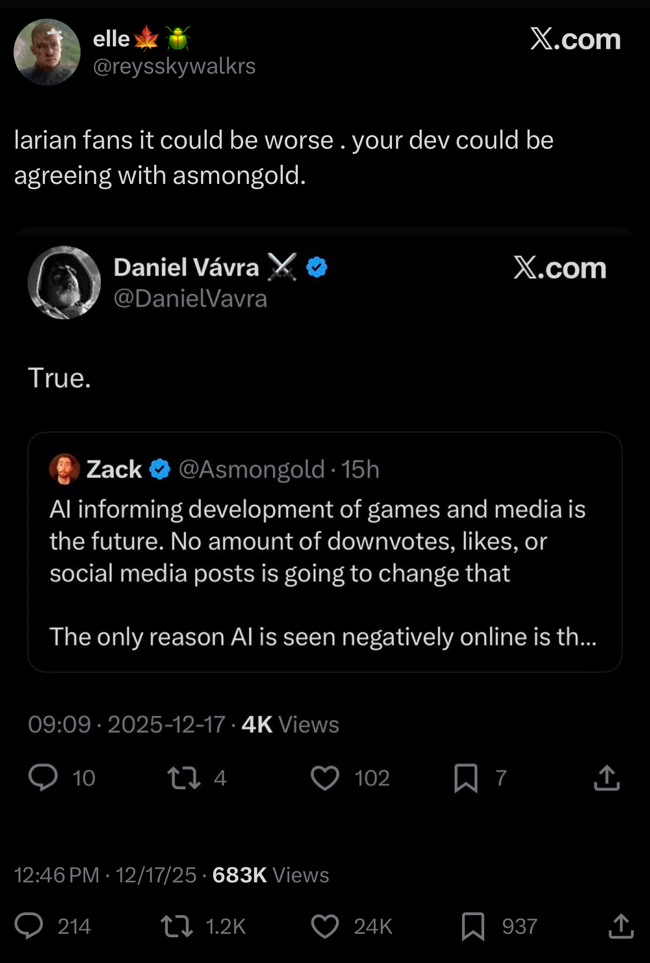 >>728839840false, it was brought up a day right after the awards through an interview , same day larian also admitted using AIwhat you're talking about is the removal of the poster AI shit which they stealth patched after players started talking about the use of AI in the gamenext?