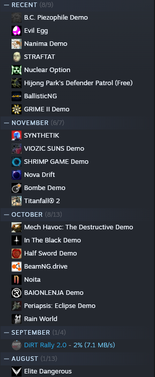 my main hdd has recently died and i have just gotten the replacement so i ended up playing mostly small games (and shit that happened to be on the other drives) and demos in the past few months on steam