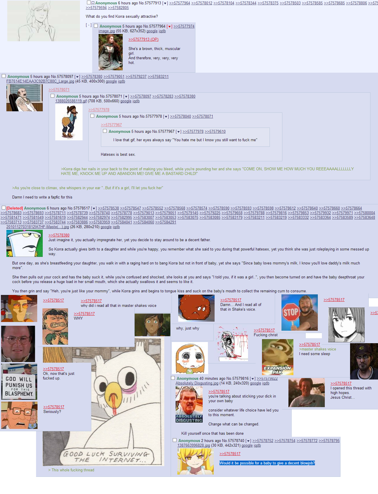 >>729755359Consider the fact that degenerate threads already happen often enough on the normalfag 4chan boards. The tilefuckers, the grilled cheese dicksuckers, all of them. I don't think a board could survive much of those when set against a furfag backdrop, unless it's a no holds barred quarantine like /trash/ is.Even horsefuckers have one show the locals use to know where the outskirts of their relative normalcy are. /fur/ is a generic catch-all that would be pulled in every direction until torn apart.