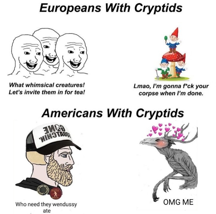 >>729758149>European cryptids>forest creatures from fairytales to teach children valuable life lessons>American cryptids>retarded fantasy monsters that 35 year old schizophrenics living out in the woods actually believe in