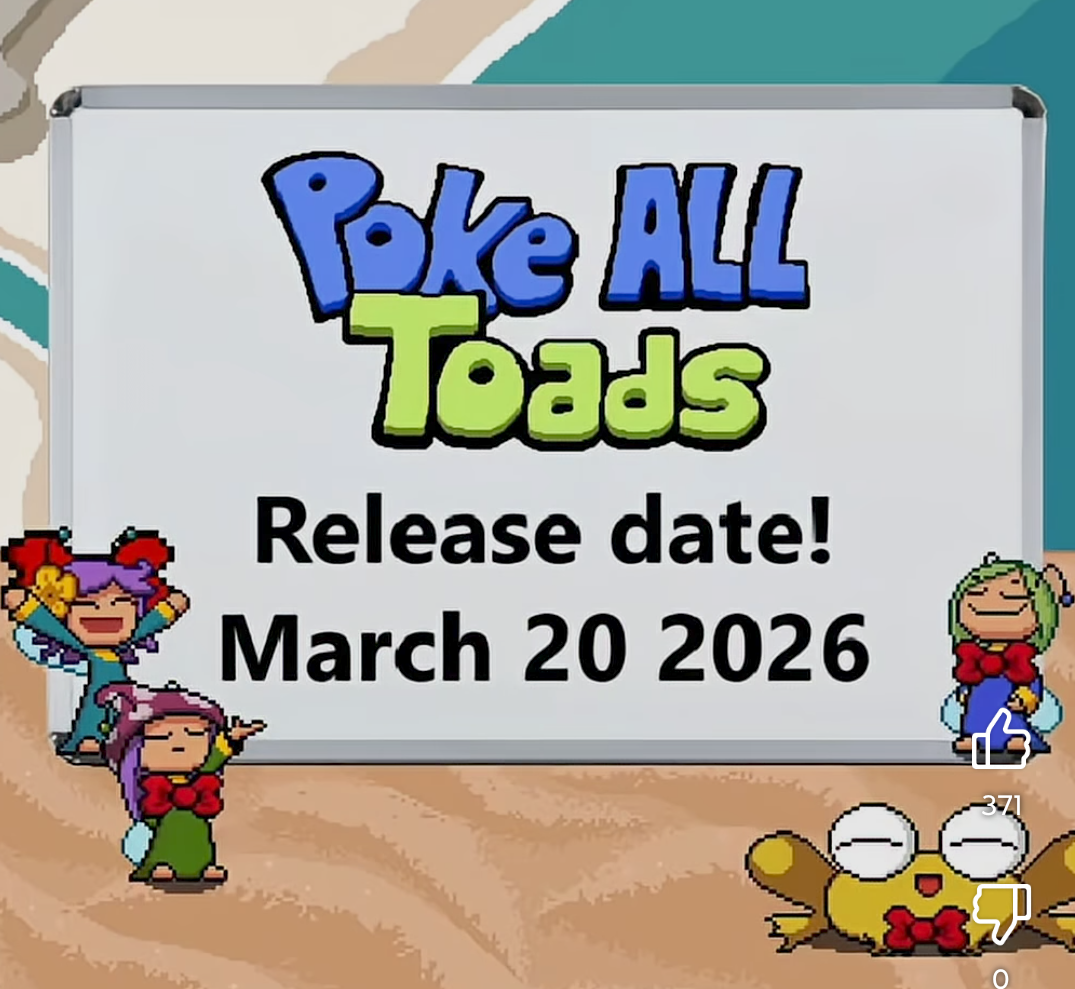 Poke all toads is coming out on March 20, 2026. I remember when I first played the demo of this game during the June 2024 next fest, where it didn't even take part in the event. But some shill managed to slip it in during the threads. Good times.>poke all toads came out after silksong>poke all toads came out before your turn to die chapter 3>poke all toads dame our before Ciconia Phase 2what a life