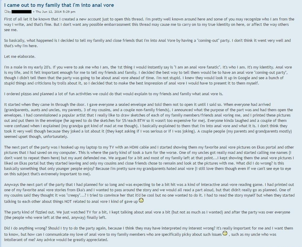 >>736313596You misread my post I think, because that's what I'm saying too. I think there's maybe a legit vorefag on the American Dad writing team, but Edmund just seems to use it as comedic fodder. I do think you have to be around his level of internet exposure to have a concrete understanding of vore. Though vore does seem to be weirdly popular with the younger generations, so perhaps it is very, very incrementally becoming more 'mainstream'. I know of at least one artist that had a meltie because they were featured on some Youtube lolcow hitpiece.