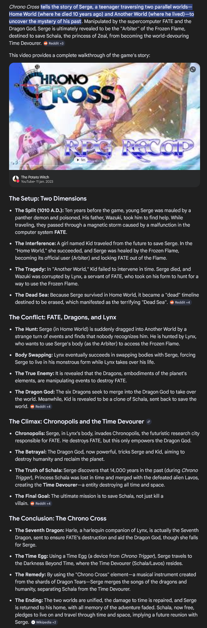 >>736412298He's not wrong if a bit hyperbolic. The actual story is too convoluted for its own good and most other aspects of the game aren't great either other than the music, the general atmosphere and graphics which are superb. Most of the blame goes on the director for okaying having 40+ playable characters in a JRPG, like this where even 10 playable characters is pushing it. It really feels like they focused on flavor text as opposed to the main plot for most of the game. I understood what was happening. I just wish it was more like Radical Dreamers and focused on Serge, Kid and Gil and maybe like 2-3 more party members.