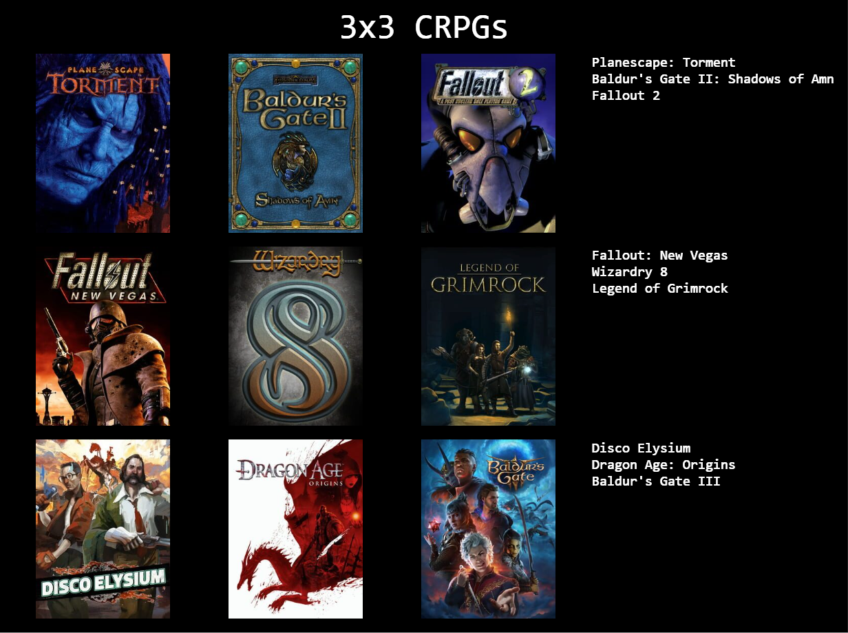 I figured I'd do something fun and do a 3x3 by genre, since my actual 3x3 hasn't changed in god knows how long.