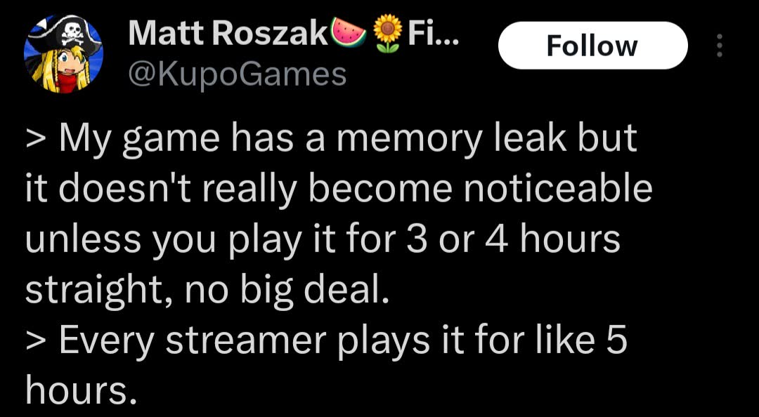 >memory leak after 3 hours>no big dealGame devs are not real