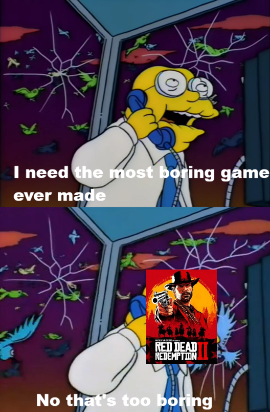 >>736438254>100%'d the original twice>Barely complete act 2 and have tried countless times to play RDR2I honestly can't put my finger on it, I think it's maybe just too restrictive and slow the entire way through. I never cared about Dutch or anyone else in the gang, I thought they were all equally awful.
