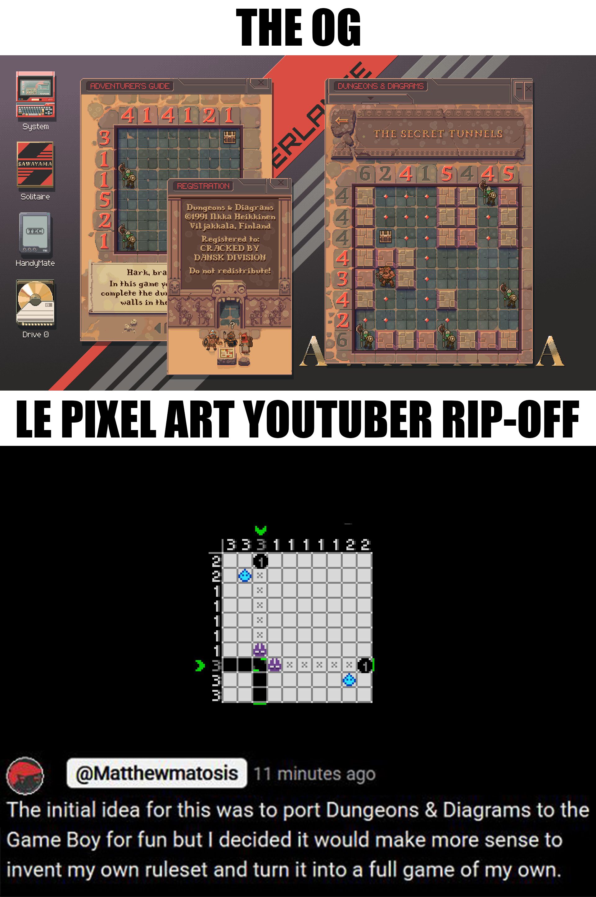 >>729480423Huh, how are they the same? Both of them look like picross. If that's the only way they're comparable then this complain makes no senset. haven't played them