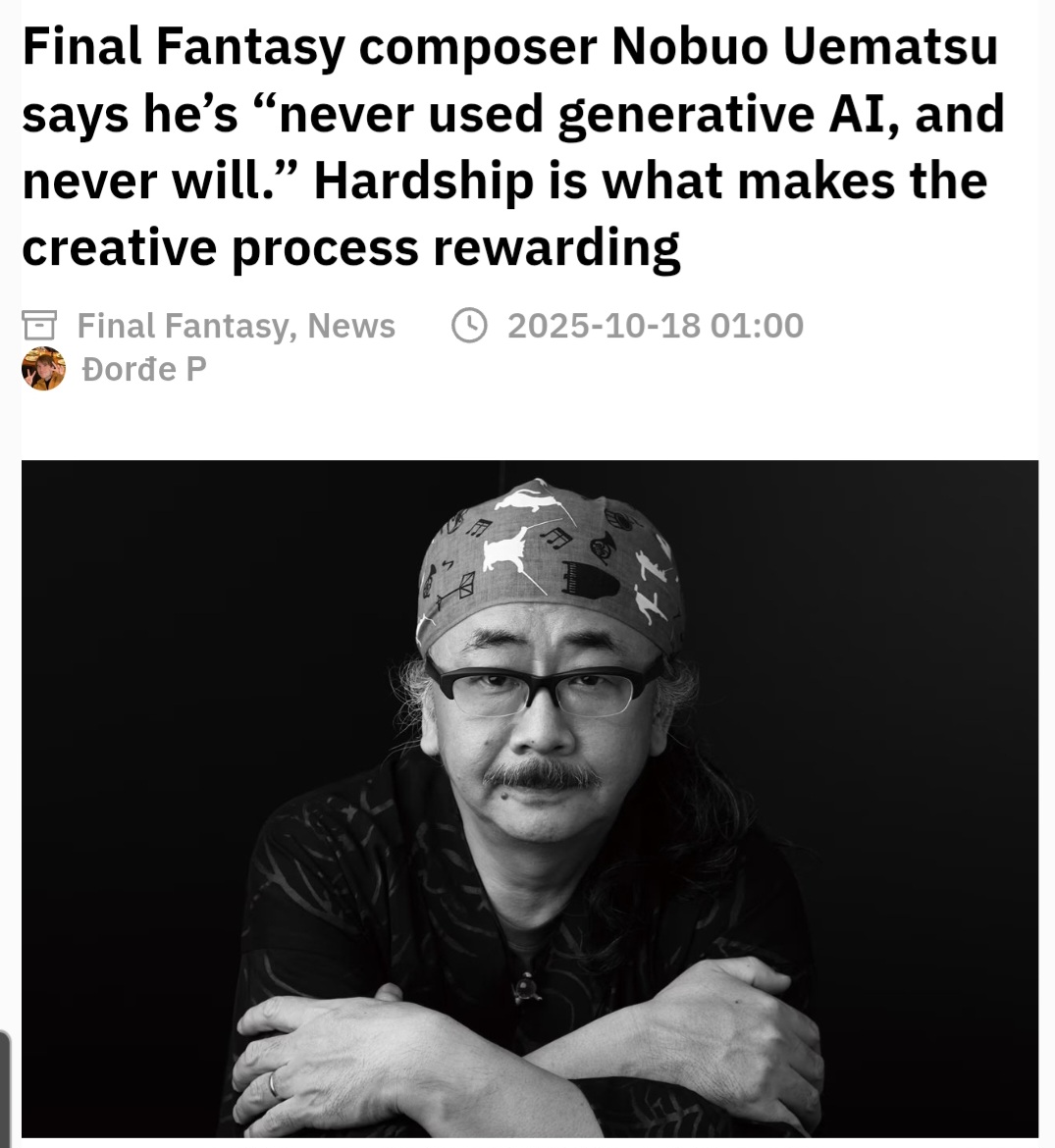 The guy who made the Final Fantasy 7 and 8 music ( Two of the greatest soundtracks in overall media history ) is against AII think he is mistaken unfortunately. People are just going to use it create games and art while pretending they aren't. Expect nearly every single beloved game to be remade in 10 years time very quickly with minimal effort because of AI