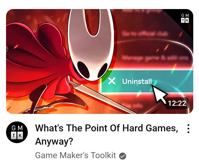 Some of you zoomies don't know this, but hard games were invented by arcades in order to steal difficulty from children. They have no artistic value whatsoever, they are purely a monetary and financial decision. No game should be hard EVER.