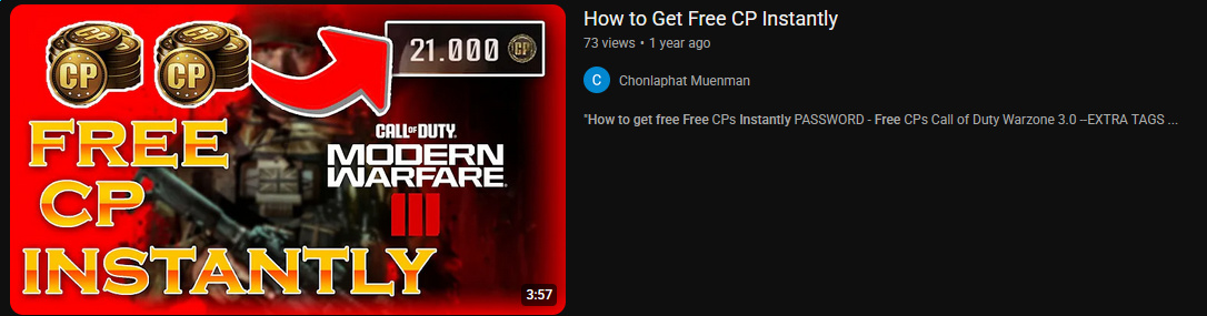 Guys, I came across this video titled "How to Get Free CP Instantly" for Call of Duty: Modern Warfare III. It promises 21,000 CP for free... instantly. The thumbnail is loaded with gold coins, and the video description talks about "passwords" and "extra tags" to unlock free CP.Sounds fishy, right? Probably a scam or some kind of exploit that will get your account banned. Be careful with these things. They might ask you for personal info or to download something sketchy.Has anyone else fallen for this type of thing? Can confirm, just reporting these videos for being misleading.