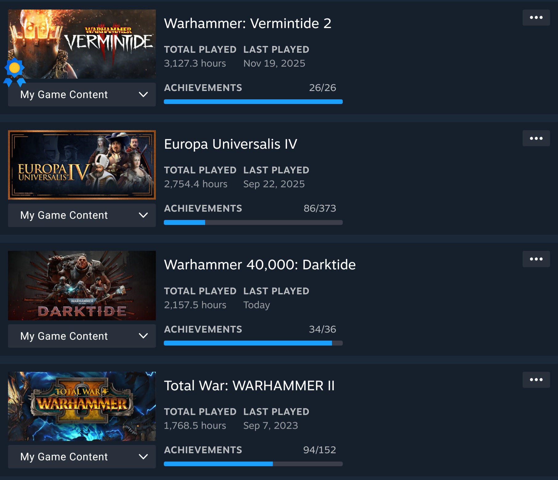 >>736265985My favorite game changes every few years but currently it's Darktide. My favorite before that was Total War: Wargammer II, before that it was EUIV and before that it was Mount & Blade Warband. Honorable mention to Vermintide 2 which is my most played game on Steam but was never my favorite.Hours: pic relatedDarktide's biggest flaws are by far the sound cues and the update cycle. The engine has a limit on the number of sounds that can play and some fucking retarded swede put gun sounds as the highest priority while instant-kill specials like bursters are lower. I don't need to hear the bright red lasers, I DO need to hear the suicide bombers and permastun trappers. The updates are seldom, hit or miss because their managers like to chase trends from 3 years ago and Fatshark never-ever has community interaction because they rightfully got shit on for saying dumbass things in the past so now they don't talk to us.