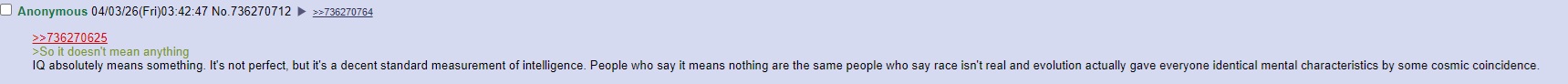 >>736270625>So it doesn't mean anythingIQ absolutely means something. It's not perfect, but it's a decent standard measurement of intelligence. People who say it means nothing are the same people who say race isn't real and evolution actually gave everyone identical mental characteristics by some cosmic coincidence.