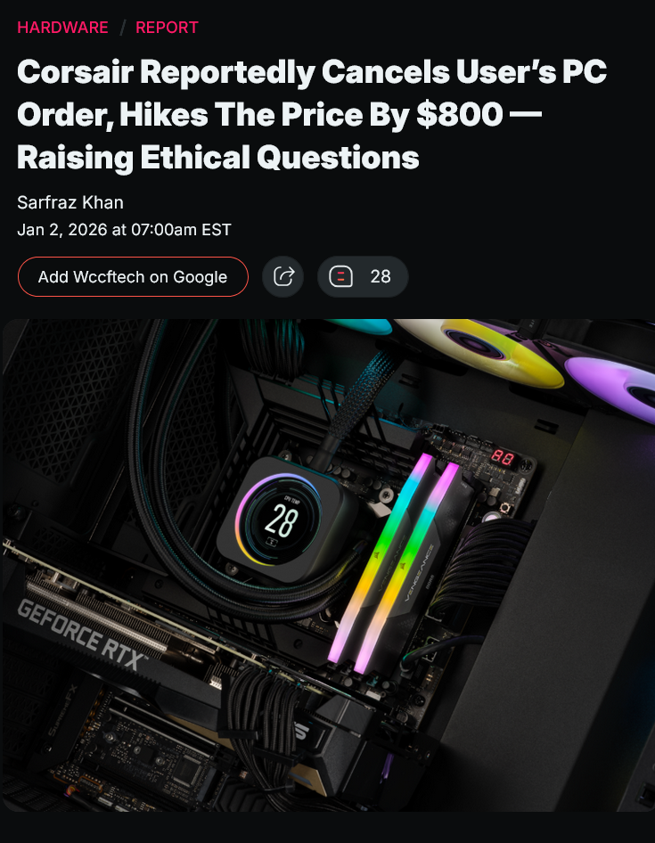 >From the screenshot, it's visible that he paid $3,499 on the order, and the user said he received the invoice from the company. However, upon checking his email, he found that Corsair cancelled his order without listing any reason.>When the user tried to place the order again, the website showed him a new price tag of $4,299, which is a staggering $800 price hike. Good. Fuck 'em.
