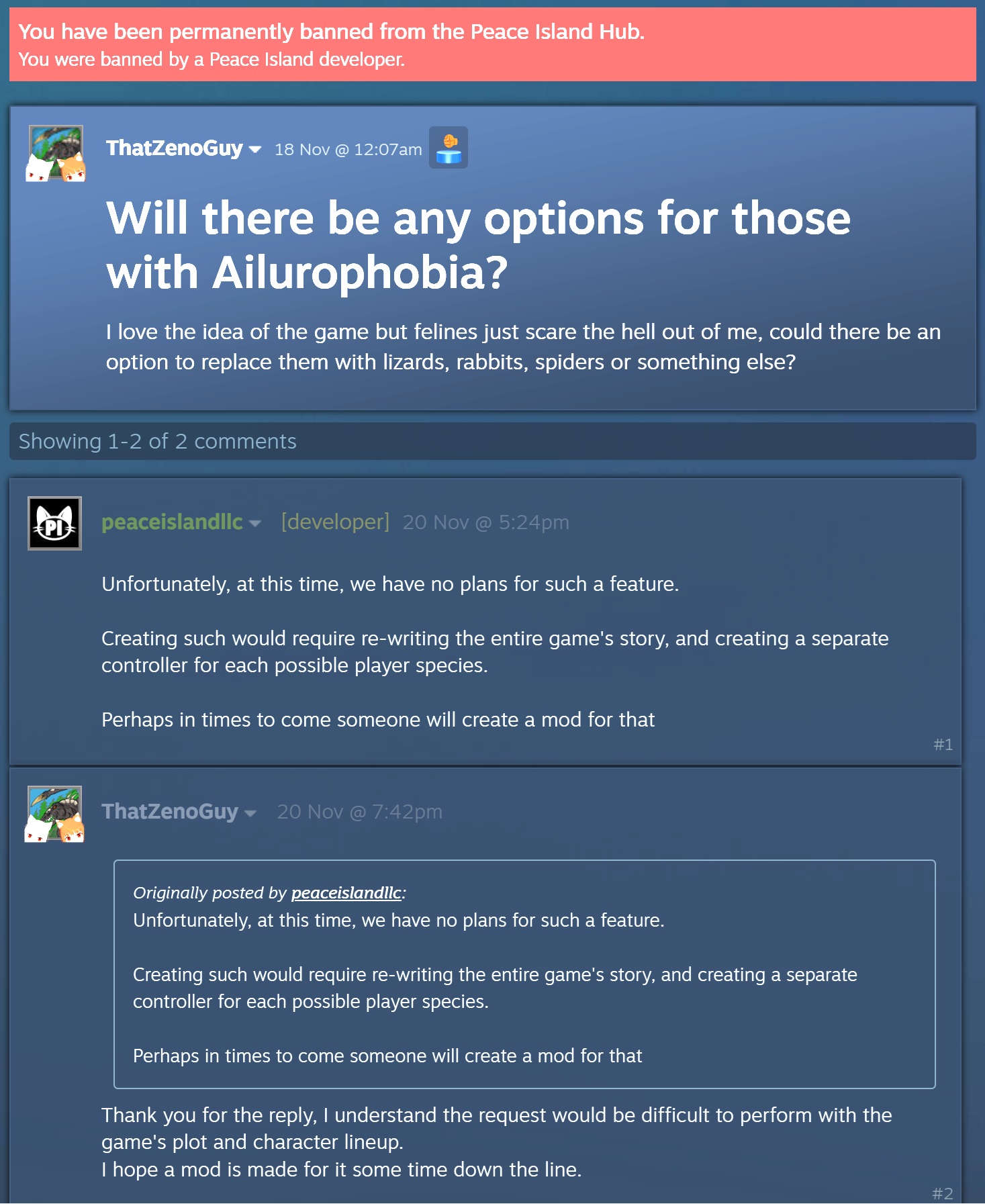 >>729683047Yeah, phobias are nonsensical by definition. But what's even less understandable is the interaction in your image. To the point I'm calling that everyone clapped afterwards. If you're audacious enough to ask that the developers completely change major parts of a game for your convenience, I don't think you're likely to be the sort of person to take it well when they say no.