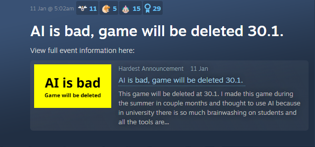 >Guy uses AI on his video game>Meets a woman who tells him AI is bad>Guy is convinced of this and deletes his gameAI chuds btfo again. Women will save this world.