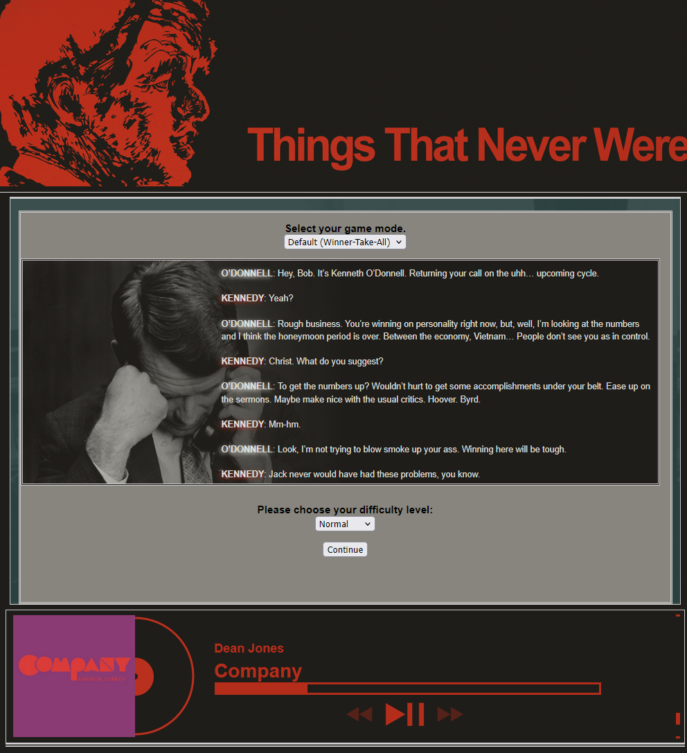 Since people enjoyed it so much last time, time for another run of The Campaign Trail. Do you have what it takes to win a presidential election?Previous threads:>>730573510>>730538179I know I said I would do the GOP side but given /v/'s "skill" I think we need to go into just a regular RFK gameThread theme:https://www.youtube.com/watch?v=l3ODpqVUmWc