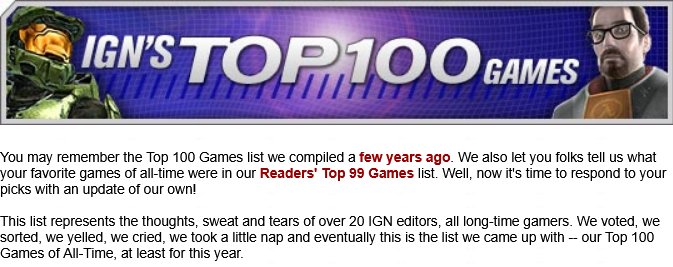 # 100 // River City Ransom# 099 // Ultima Underworld: The Stygian Abyss# 098 // BattleToads# 097 // F-Zero# 096 // Mafia# 095 // Herzog Zwei# 094 // Tom Clancy's Rainbow Six# 093 // Quake II# 092 // Dragon Quest# 091 // Virtua Tennis# 090 // Master of Orion# 089 // Alone in the Dark# 088 // Final Fantasy VII# 087 // Thief II: The Metal Age# 086 // Final Fantasy XComment too long. Click here to view the full text.