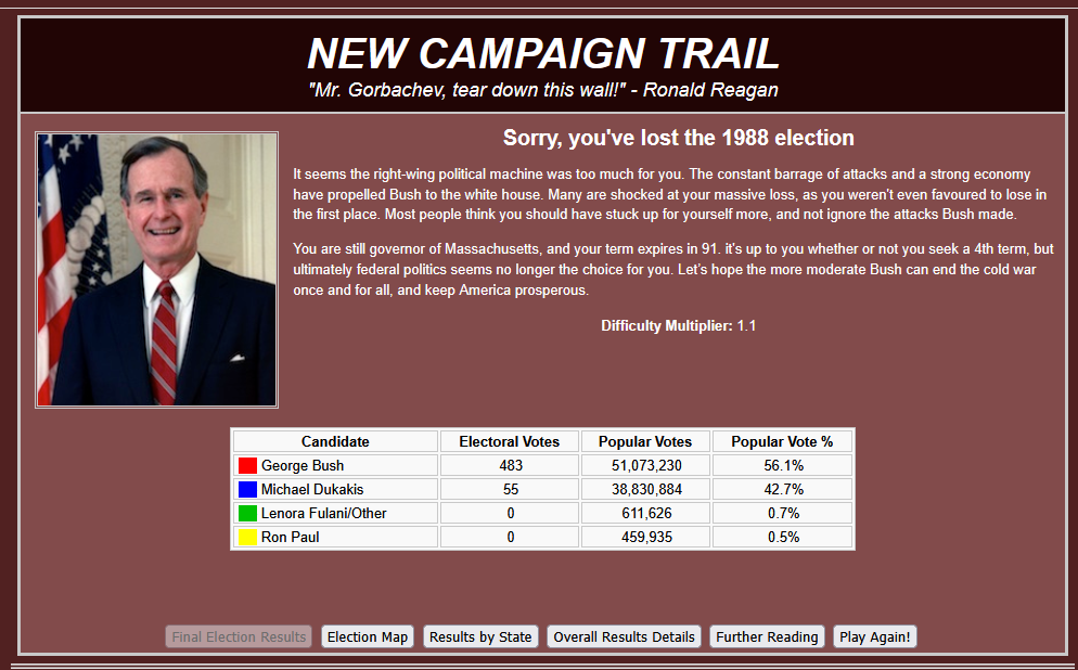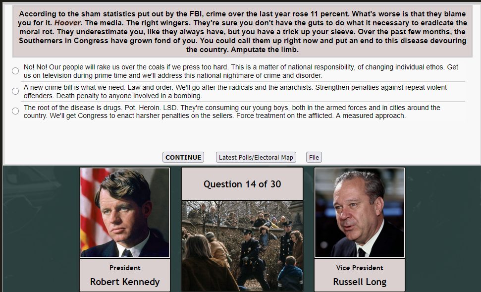 Since people enjoyed it so much last time, time for another run of The Campaign Trail. Do you have what it takes to win a presidential election?Previous threads:>>730573510>>730538179I know I said I would do the GOP side but given /v/'s "skill" I think we need to go into just a regular RFK gameThread theme:https://www.youtube.com/watch?v=l3ODpqVUmWc