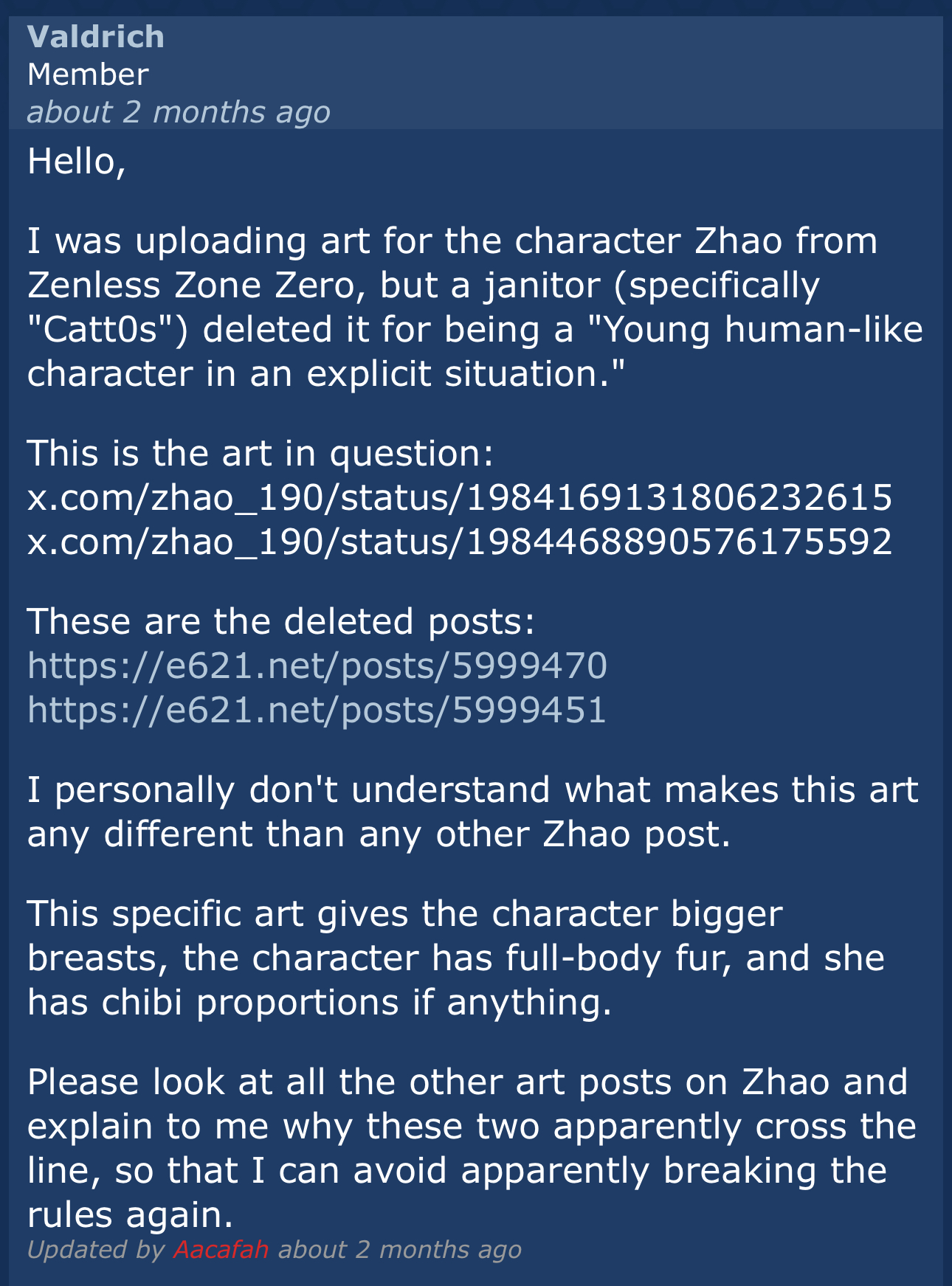 >>731030416NTA but a lot of her art gets deleted. It depends on how much the artist emphasizes her fur.>but that's all furryIt's not. There's plenty of cub art on the site where there is zero effort to show fur tufts but the head is very clearly anthro so it's allowed to stay. Zhao does not have that benefit. Depending on the posing(for example if her feet are off camera) and effort put into showing her fur texture she can look very loli-like and that stuff gets banned.