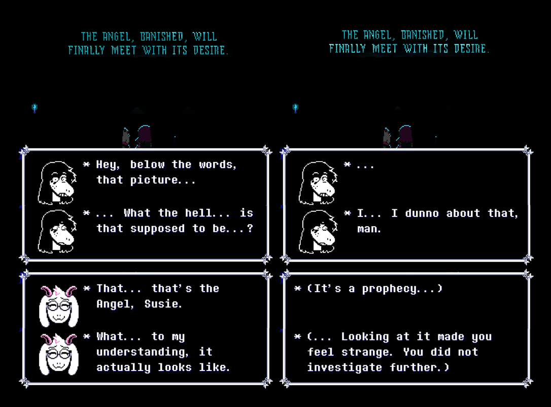 >>730065483>Player Angel vs Noelle AngelThese aren't necessarily contradictoryNoelle is definitely not "THE Angel" worshiped in the Hometown religion and addressed in The Prophecy. The Angel is depicted in The Prophecy, and Susie reacts to seeing it with confusion and bewilderment, apparently unsure of what she's even looking at. That's probably not a depiction of Noelle.But Noelle could still fulfill the role of "The Angel" in some symbolic way, like how the legend in Undertale has multiple characters that could interpreted as fulfilling the role of "The Angel." The Prophecy speaks of the Three Heroes, along with "The Girl" separately. The Delta Rune depicts the Three Heroes represented by the triangles with The Angel above them; Noelle could be this fourth figure.THE Angel is likely the player, in some sense. The Angel is described as watching over characters, guiding them, and using its power to light their way. We literally watch over the world from a top-down perspective (diegetically established several times in Chapter 3 alone), guide Kris and the others with our commands, and use "our power" to light up the dark and seal the fountains. "Raise Up Your Bat" makes the same allusion to "your heart" shall "guide you" and "shine you the way." The Titan combines four angelic wings with a realistic human face which gets replaced by a four-pointed star like a SAVE point. It's not too subtle.