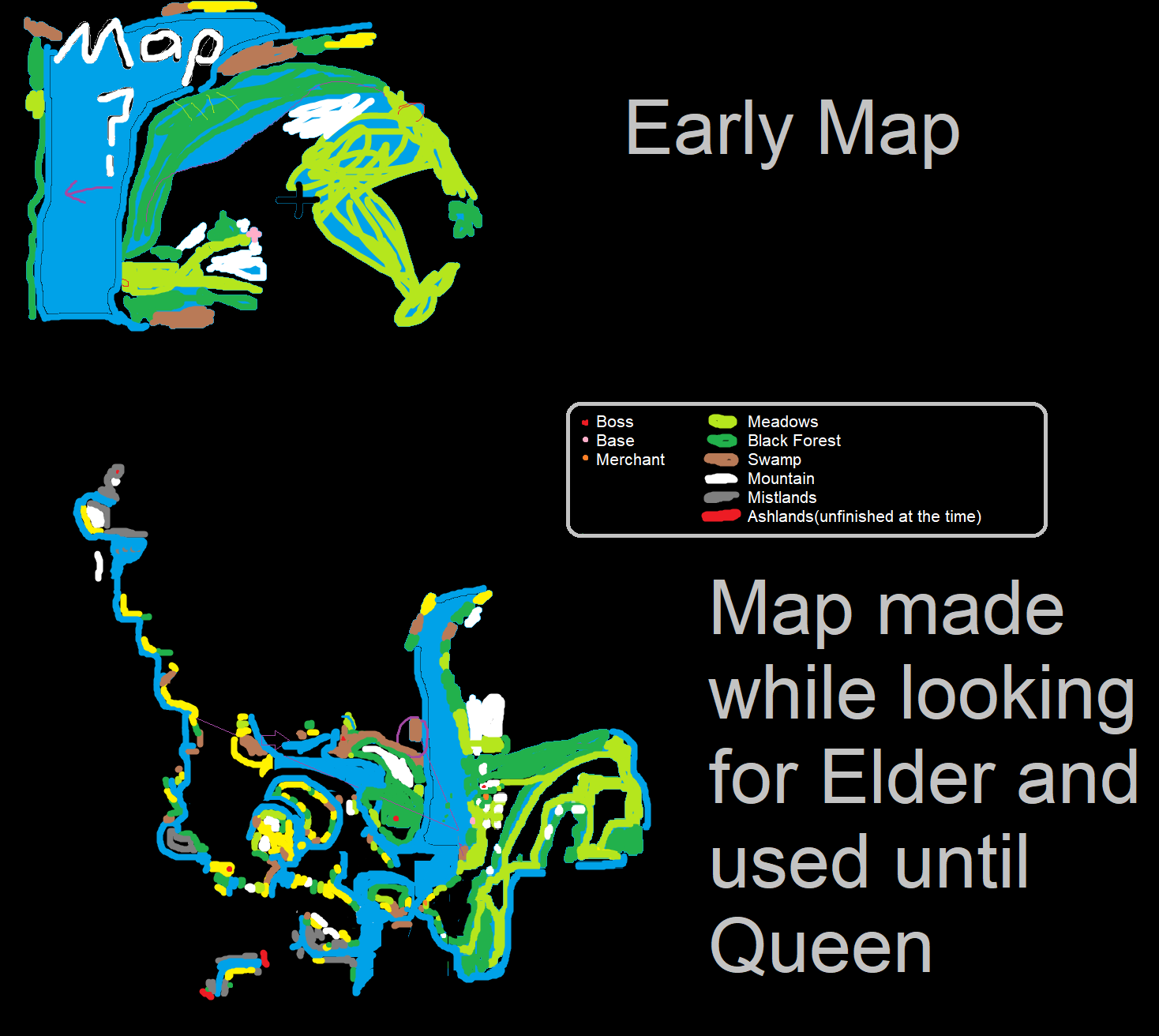 From my first game with no in game map.When I played this I also tried the aiming mod and a first person mod.If you look down, you strike down, it was a modded solution for sloped combat.I later added a mod that increased render distance.One time I climbed a mountain to get a better vantage point, I think I was trying to find Yagluth, and I was so disappointed that I couldn't even see all the trees on the fairly small island I was standing on.The purple lines are me trying to figure out where BoneMass is, with no map setting, you are angled towards the next boss instead of getting a marker, so I was just trying to go in a certain direction but I overshot it.The disconnected part of mistlands and ashlands is because I got lost in a storm and couldn't make sense of where it fit in with the rest.Up and down on this map doesn't match with true north and south, I mostly added to the map by following coastlines and didn't know my orientation all of the time.