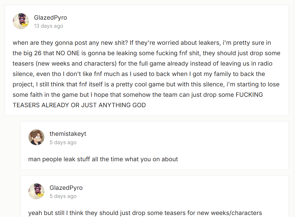 >>730684492Yeah once, I backed Ghost Song and after a bunch of years just had to accept that I had gotten got. Then one day it actually came out.