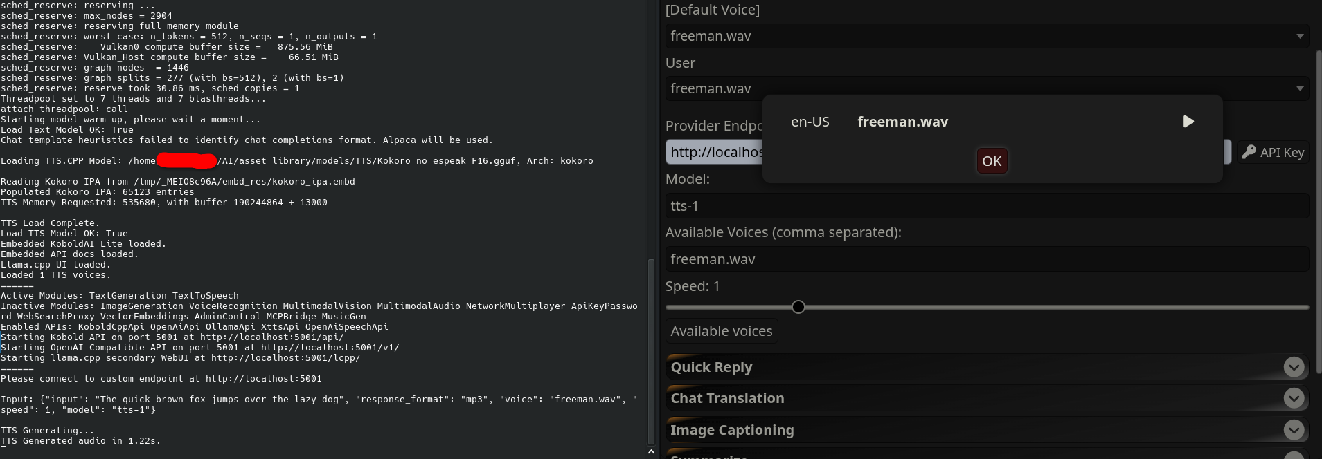>>736208278Haven't got ST running so I can't check but it's MOST LIKELY got a generic "OpenAI compatible API" option for TTS where you'd paste Kobold's UI's URL in there. Possibly adding /v1/ it if it doesn't work out of the box. I know that's how you can get image gen running in ST with the model loaded through Kobold but I don't remember ST's TTS settings off the cuff so I might be completely wrongAs to your question, you currently have it set to AI only, maybe just set it to "All" at first so it narrates your input just in case there's something fucking up somewhere. Also maybe try some of the generic voices included with Qwen to ensure that's working properly at all 'cause it SHOULD be as dead simple as picking it from the voice dropdown like that>>736208484baste actual rememberer