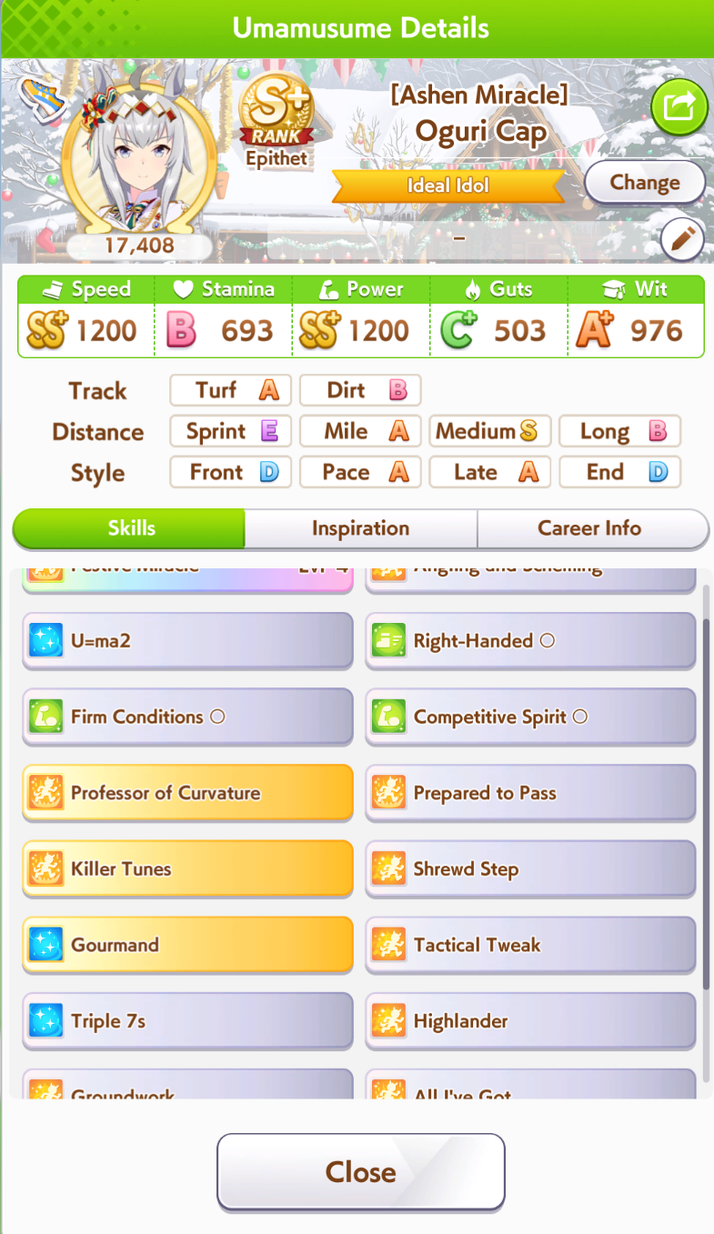 1st ace run for next CM, feels like a bit early to say I'm done but this is by far the best uma I've ever gotten outside of gutsmaxxing meme builds.>head-on outside of pic