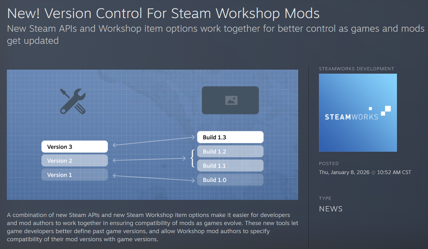 Good news: Steam now allows workshop mods and games to opt out of annoying and potentially compatibility-breaking automatic updates.> Mods don’t suddenly stop working.> Players can stay on an older, stable version if they want.Steam will automatically download the correct mod version for the game version you’re running.
