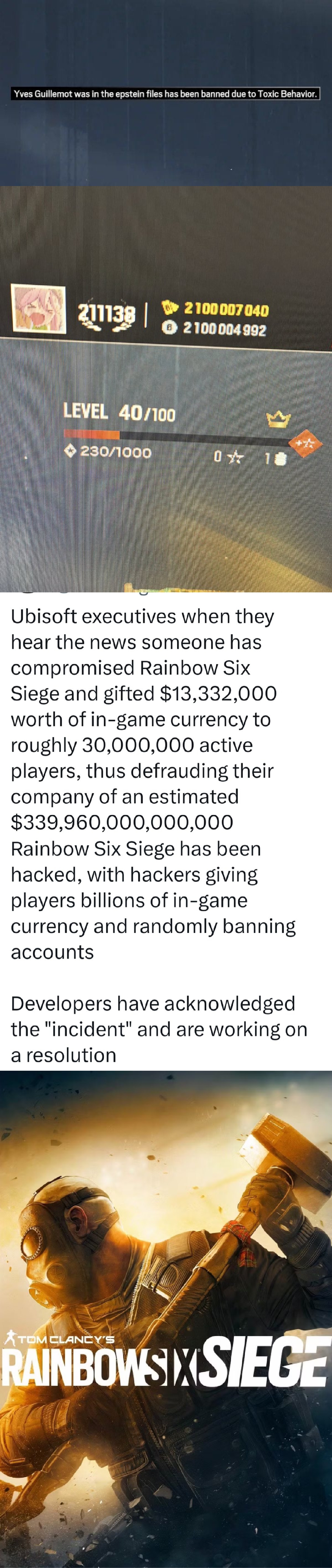 >He gave players 2.1 billion R6 coins and called the Ubisoft CEO an idiot.hahaha