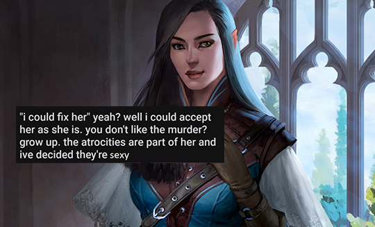 >>724975894I don't like when succ waifu is written as stupid. An assassin talks about putting her to sleep and her reaction is "I don't get your meaning but I sense hostility". Really now? She's supposed to be an ex-seductress, corrupter of mortals, a master backstabber turned double-traitor. Her class is espionage expert and that's her level of social skills? Just because she's the designated pure waifu doesn't mean she has to be written like a teenage airhead. Kinda lazy on writer's side idk.