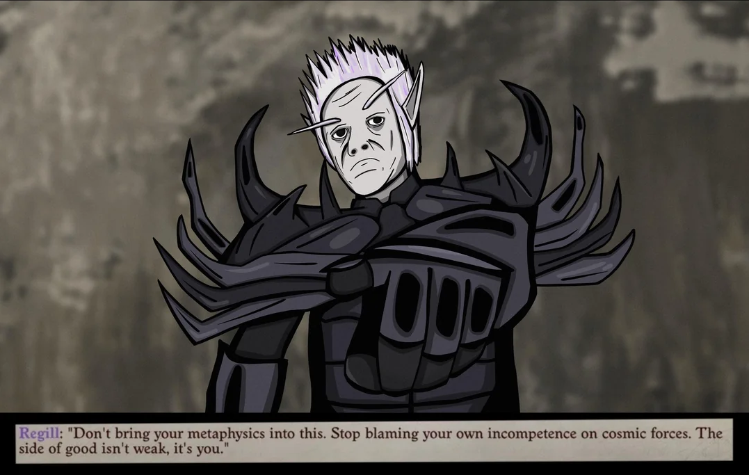 >>724975894Greybor dabbing on Arue was entertaining. So was Daeran trying to bait her back into being a Succubus. I'm such a good commander for having them with her every time we go out>>724976092>sends you on what's probably a suicide mission to stop the crystals so they can win the war>damn I didn't think the KC would actually die!>oh well! i'll just leeroy jenkins the entire crusader army into Iz where Deskari is waiting to eat it!>yeah that'll work!Golarion's greatest monarch fr fr