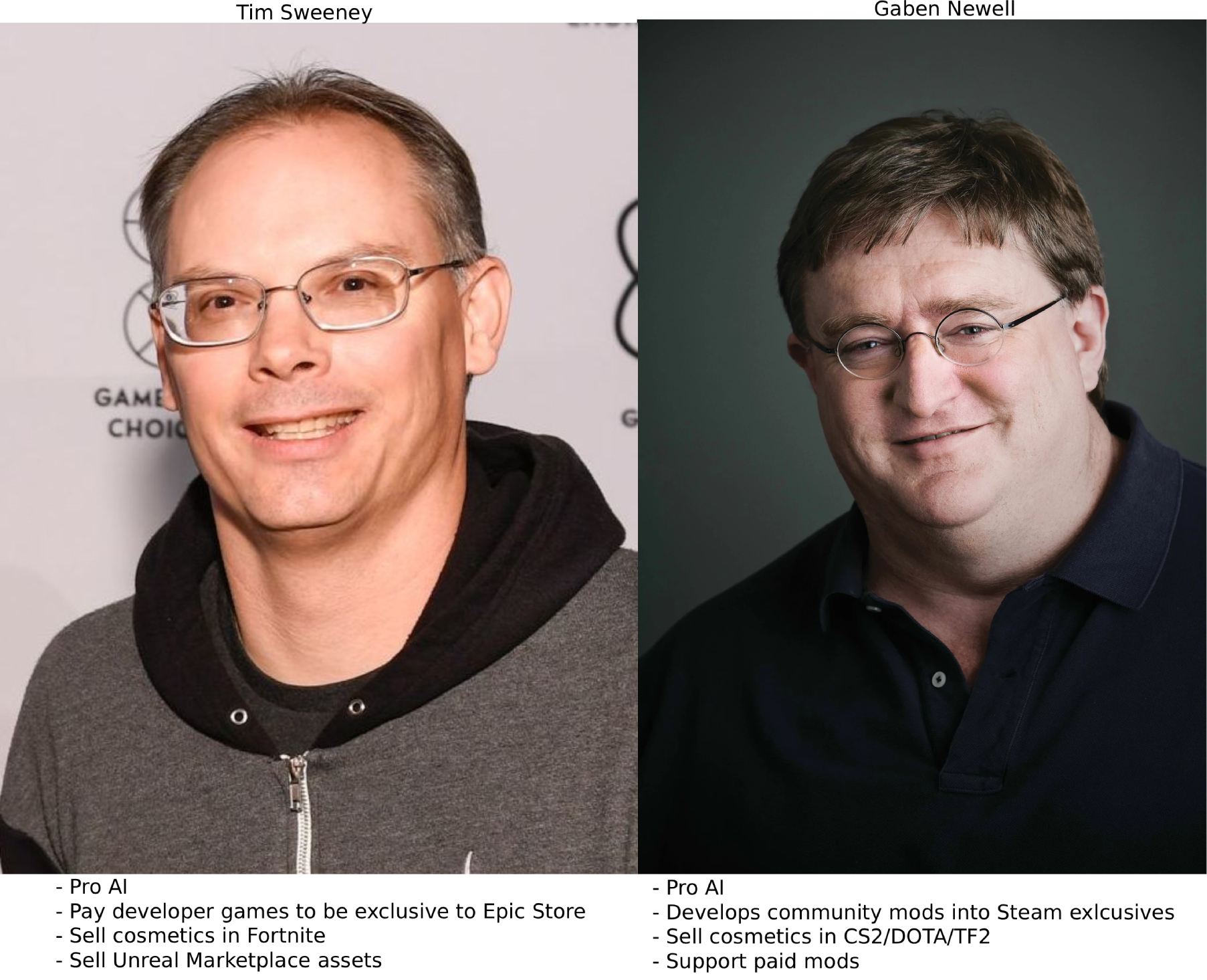 >>734215008One is a publicly traded company and thus obligated to be retarded for short-term gains.The other is not publicly traded and thus will not cut off its own nose to spite its face.>>734215818Tim does not care about developers, he cares about locking in developers as contractors and attracting a prospective audience of (man)child gamblers.His business model of free games has just lead to no one actually purchasing games on his platform.