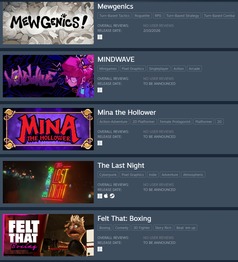 There seemed to be some interest in the thread I posted yesterday so I'm posting again. I'd just like to discuss it more in a place that isn't the Mewgenics discord server (full of children).>What is Mewgenics? Mewgenics is a roguelike TRPG made by Edmund McMillen, creator of The Binding of Isaac and Super Meat Boy. You take cats on runs with events, battles and bosses, then take them home where you can breed them to make kittens that carry their attributes and abilities. It plays like XCOM and Into The Breach but with very deep roguelike elements. It has a similar run progression to Slay The Spire with branching paths and bosses at the end of each chapter. >When does it come out? It releases on the 10th of February. There is no preorder, but Edmund has stated the game will cost $29.99 and that there will be some release day discount.Resources: >Steam Pagehttps://store.steampowered.com/app/686060/Mewgenics/>Gameplay videoshttps://www.youtube.com/@EdmundMcMillenGamesComment too long. Click here to view the full text.