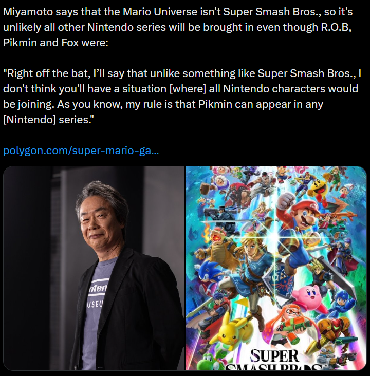 >“I don't think you'll have a situation [where] all Nintendo characters would be joining [together in one film],” Miyamoto told Polygon.https://www.polygon.com/super-mario-galaxy-movie-smash-bros-shigeru-miyamoto-interview/