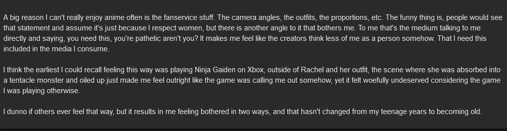 >>736126832>"I want to be in control of my sexuality. I'm fixated on embracing and developing my beauty and sexual appeal, I just want to do it on my terms.">Ah, I see, she doesn't want to be seen as a sexual entity at all. I am a very perceptive person.