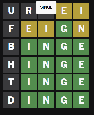 Optimal play here would be to consider all possible -inge words at the fourth step, to find a word that contains as many of the possible first letters as you can and test that word. Eg THUDS