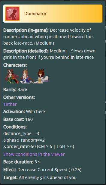 >>723004037Sidegrade Late Surger that tries to get a good position mid-race.>20% Stam / 10% Wit -> 10/10/10 Stam/Power/Guts>Ult that basically activates whenever she passes someone near the end -> Recovery ult after she uses two skills mid-race (will be buffed to increase speed too eventually)>Wet Conditions/Gourmand/Outer Swell/Body and Mind -> Sunny Days/Fast and Furious/Tail Held High/It's On
