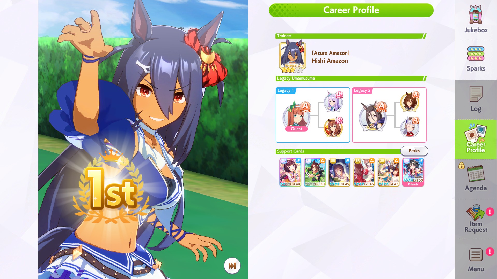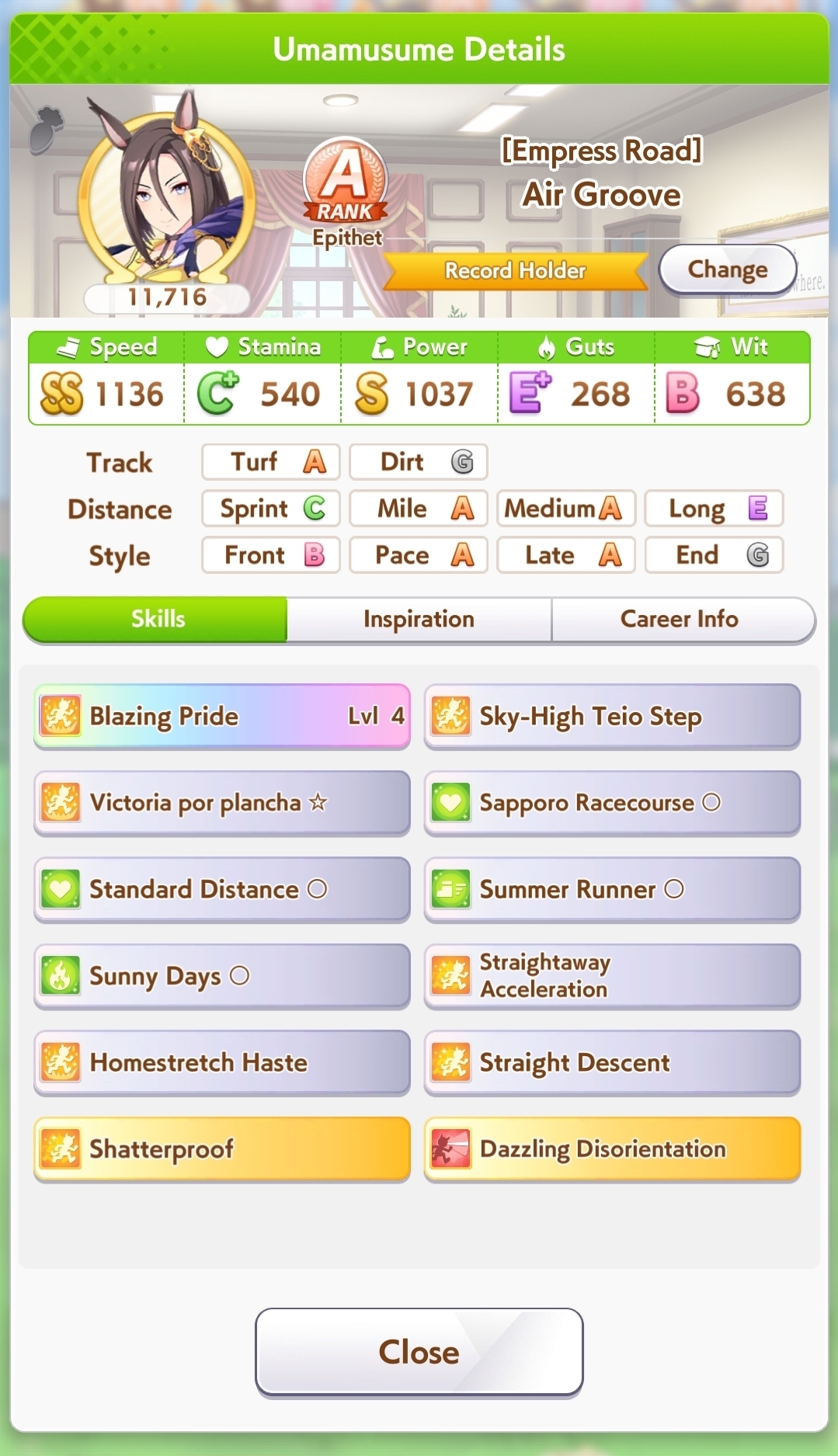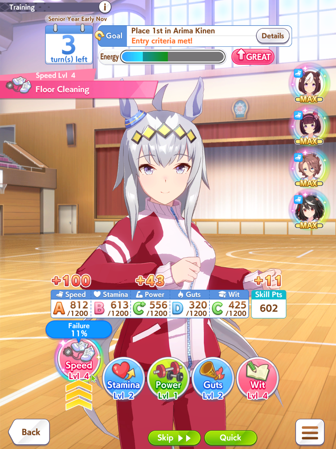 >>723001063went 3-2-2-2 on day1, tried doing some runs for better aces but groundwork inspiration failed to proc both times so I've decided to actually give up (for real this time). gonna start (continue) rolling for a 9* stamina 9* groundwork parent (only have a 7* groundwork with wack blue sparks) because apparently it's gonna be useful forever so that's my long term goal I guess. can't wait to get it in 2 years or something.