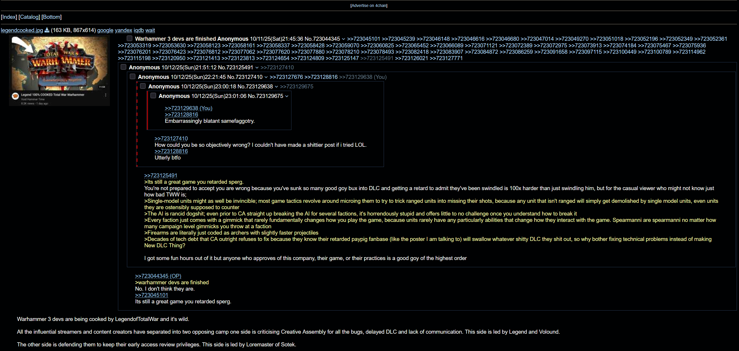 Warhammer 3 devs are being cooked by LegendofTotalWar and it's wild.All the influential streamers and content creators have separated into two opposing camp one side is criticising Creative Assembly for all the bugs, delayed DLC and lack of communication. This side is led by Legend and Volound.The other side is defending them to keep their early access review privileges. This side is led by Loremaster of Sotek.Here's a QRD:https://www.youtube.com/watch?v=4fqoVGuwhBshttps://www.youtube.com/watch?v=CEqfZGiyyz8https://www.youtube.com/watch?v=KgNtk5EHTDIhttps://www.youtube.com/watch?v=Vjh8k9wAkhMIt's over for CA.