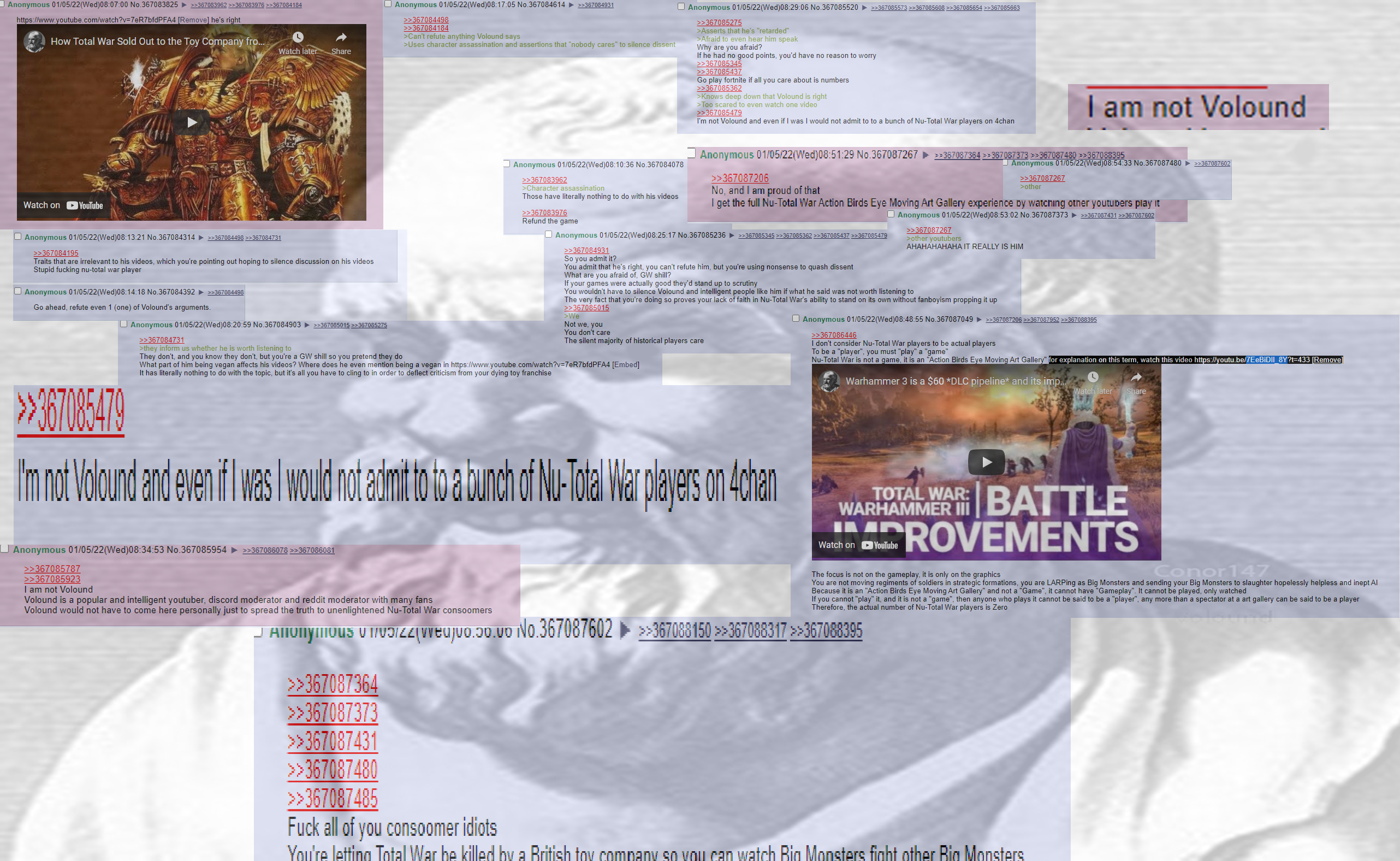 >>723044345>QRD>4 videosI bet you could reduce it to two sentences, however I don't give a shit. I like Medieval 2, Shogun 2, 3K and TWWH and if they fuck the balance I can just downpatch or go get mods.It's not like I need CA to keep making new titles, especially after doing boring rome shit again and pharaoh. Maybe I would've kept a candle burning for them if they didn't kill R3K immediately but they did