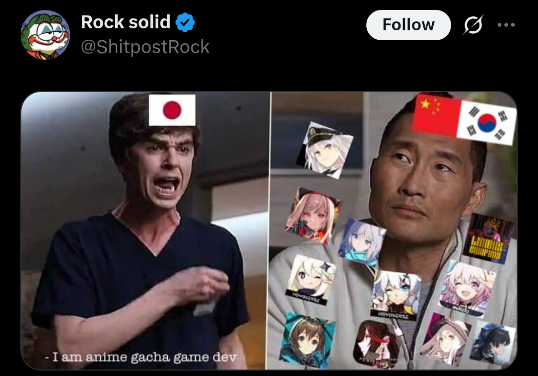 >>723059601Who gves a fuck if Korea/China have better gachaslop? Their real game line-up is just a bunch of knock-off Souls clones
