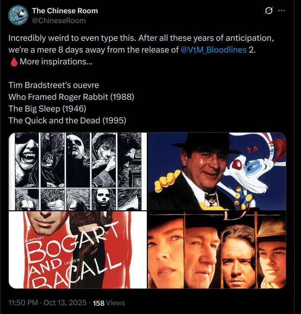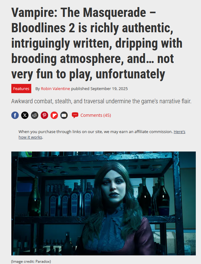 >>723185728>It’s going to be much worse than that because Cyberpunk had almost no idea what the fuck it wanted to be and strayed far from what the devs said it would be.I don't know, seems more to me they knew what they wanted, they just discovered along the way of making it that they did not have the skill to pull it off, so they repurposed everything.Bloodlines 2 seems of a different cloth: the devs seemingly know they can't pull complex gameplay (as I've been saying for a few threads, they were at least smart enough not to try and actually go full Dishonored in term of level design and systemic complexity, as far as we can see), so they've kept things simple. Now, they can still fail even that, but it does seem less likely.>>723185934>Go jump off a bridge cuck.Why won't you take your own advice?>>723186105So, talking out of you ass, then?>>723185927Heather is not a romance. She's a vitae addict. That's what bloodbond ghouls are. You're just her more or less abusive drug dealer.I wouldn't call VV a romance either. She's just a user that also happens to be perfectly transparent about it. I guess your mileage may vary about this one.That said:a) a sequel doesn't have to slavishly follow the actantial model of its original.b) Embracing a true faith hunter for penance might be a dumb move, but it *is* a classic of the genre. So embrace here definitely doesn't look like a sign of affection.
