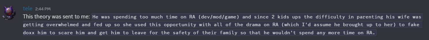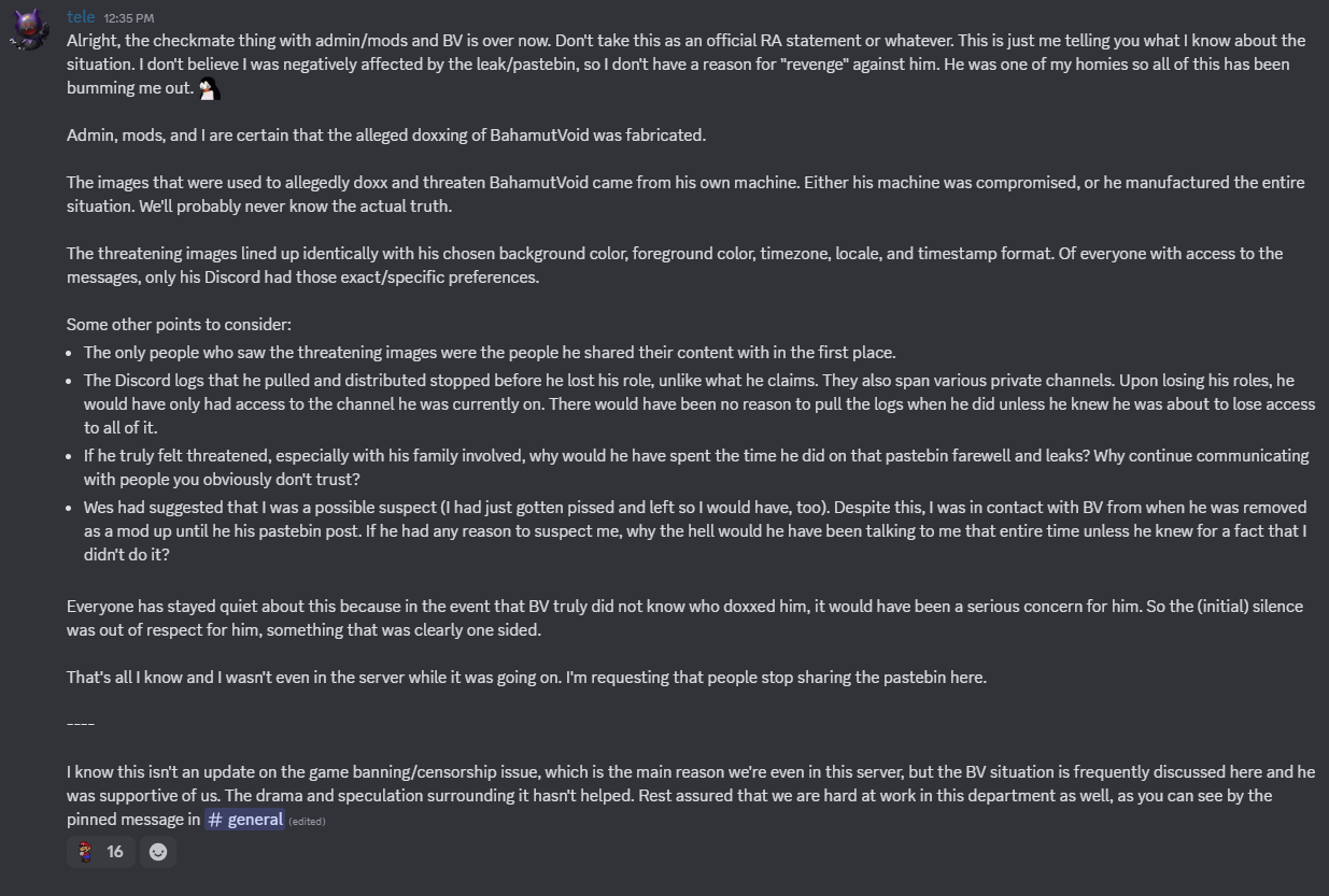 >>723194858>in addition to his pastebin, bahamut's mega, onedrive, and dropbox folders also got mass reported and taken down; anons have backupsMass reported unknownTaken down true>xkeeper has been providing ips to ra mods for investigation2 ips shared trueNo resulting action requested or confirmed>a thread on the ra forums stayed open for 2 days and ran for 11 pages, but was closed in 10 minutes by hexa after an user named xkeeperTrue>tele says on discord that he and all other admins are certain bahamut's doxxing was forged by himTrue>no proofFalseExplanation and rationale givenSome anons believe and some skeptical
